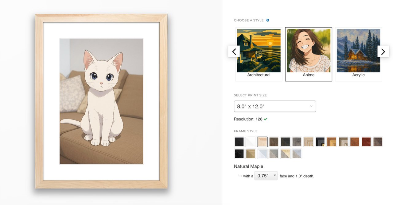 A quick overview for anyone looking to create a fun and delightful portrait of their pet: Simply upload a photo, choose a style, and watch the image transform in real time. If you don’t like the first style, try out the others until you find one you love. Once you’ve crafted an awesome pet portrait, select a print size, customize the frame style, and place your order. We’ll print and frame with the utmost care, and have the artwork on its way to you within a week.