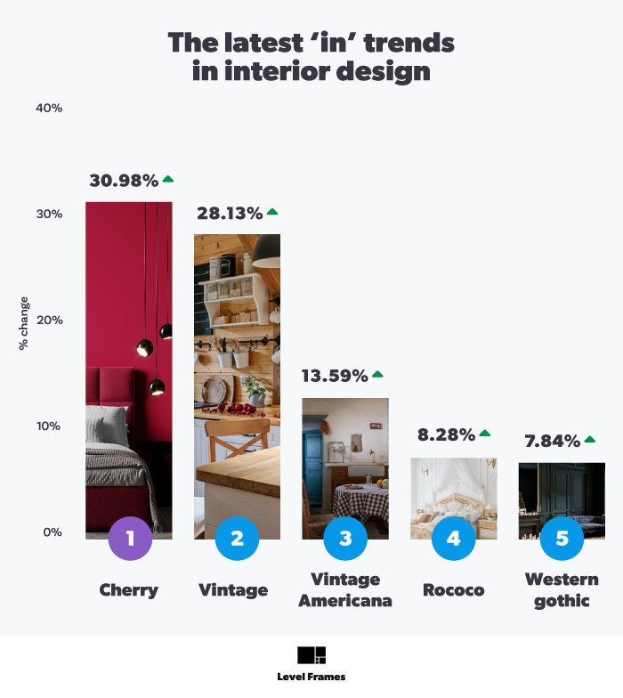 ‘Vintage Americana’ has also become more popular over the last year, with a 28.13% increase in searches. This interior style is inspired by America’s rich cultural heritage and history, combining the old and new.