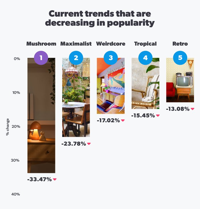 The unique ‘weirdcore’ trend, influenced by fantasy and surrealism, saw the third-biggest decrease in consumer interest over the last year, dropping by over one-sixth (17.02%). Weirdcore interiors embrace an unconventional style, often incorporating psychedelic elements. The bold and quirky color schemes and furniture designs mean this trend has a more niche audience, contributing to its impending fall from popularity.