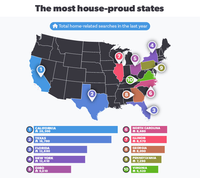 California is the most house-proud state, with 20,300 home-related searches from residents in the last year. California is also located in the western region of the country, which recorded the highest annual household expenditure on home furnishings.