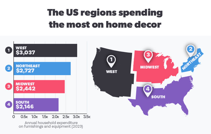 While housing in the western United States is often expensive, the wages also tend to be higher. This could indicate that those living in the Western region may have higher budgets for decor. California, for example, has some of the most expensive housing markets in the country. Many neighborhoods are made up of high-end real estate, with substantial funds often being invested in the aesthetic of homes.