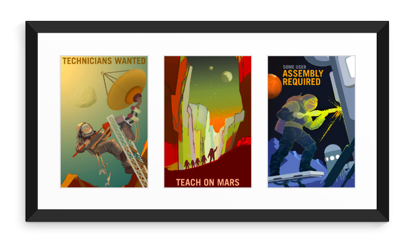 Ever wanted to be like Mark Watney from The Martian? You can get one step closer with these beautiful NASA posters on your walls. Upload your favorite poster for us to print and frame -- Tip: they'll look great framed individually with our golden ratio matting.