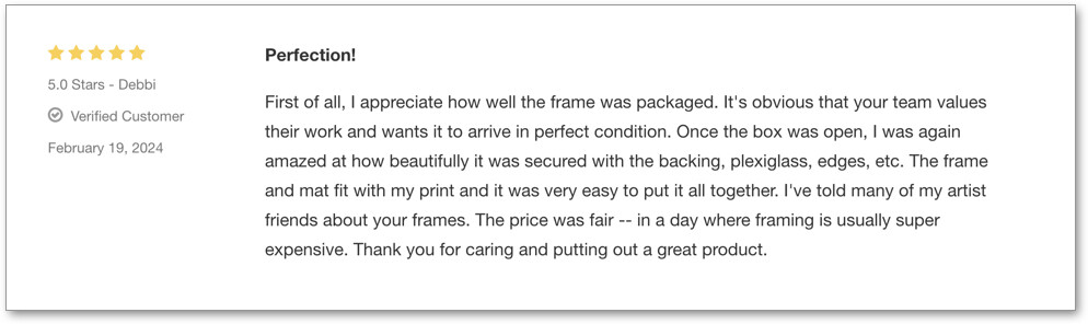 There will be a place for traditional custom frame shops for quite awhile. But we believe that online custom framing is here to stay, and will only continue to grow based on the convenience, affordability and value.
