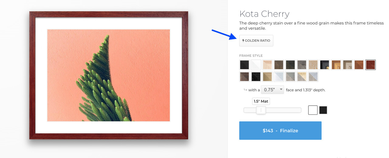 Our "Golden Ratio" button will set a well balanced frame width and matting size based on the size of your art
