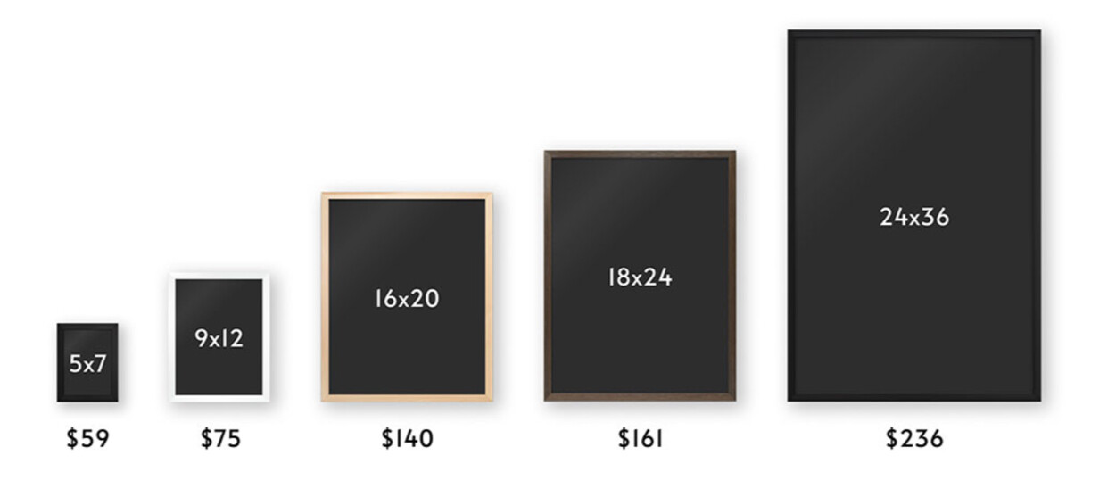 The frame size and width play an important role in the overall aesthetic. From thinner profiles on smaller pieces to large, statement pieces, you want to strike the right balance between the frame and what it contains.