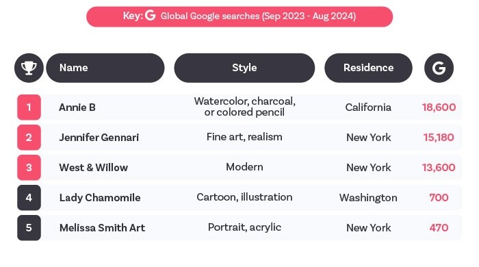 Following closely behind is Jennifer Gennari, a fine art and realism artist from New York, who has received 15,180 searches. West & Willow, also from New York, secures the third spot with 13,600 global searches.