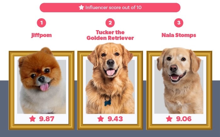 Of all the top pet influencers in this study, 24 are dogs. Out of all dog-fluencers, golden retrievers are the most successful, with famous names like Tucker and Nala dominating the top 10.