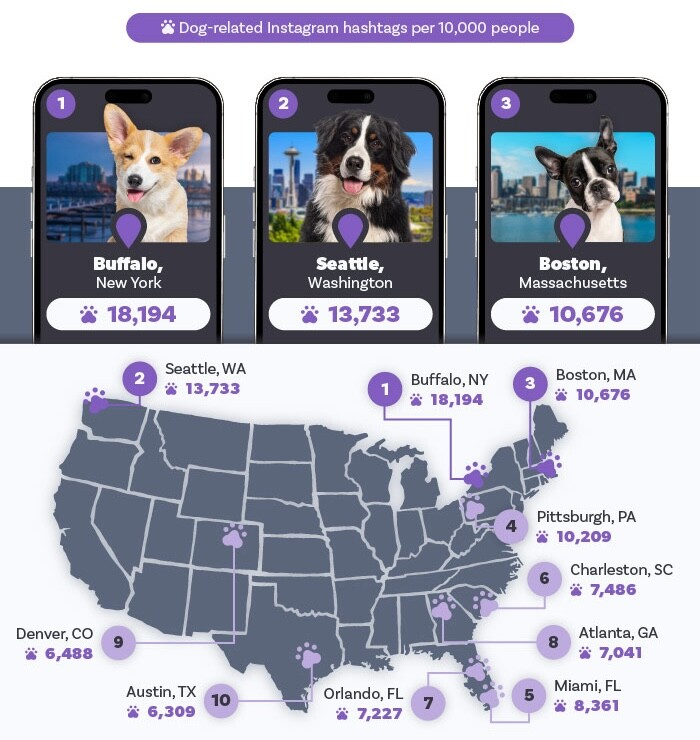 Buffalo, New York, leads with more than 498,000 dog-related hashtagged Instagram posts, equating to just over 18,000 online snaps per 10,000 people! Along with many residents showing off their pups online, Buffalo has plenty of dog-friendly spots like Wilkeson Pointe Park and Eternal Flame Falls.