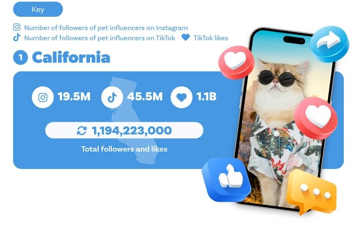 California reigns supreme in the world of pet influencers, with 1.19 billion total followers and likes across Instagram and TikTok.