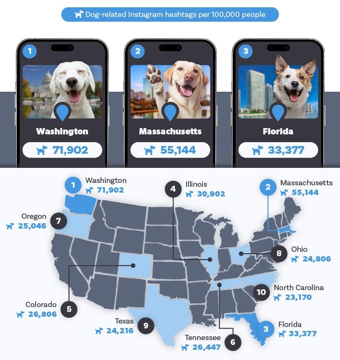 Washington tops the list with 1.1 million dog-related Instagram hashtags, equating to 71,902 posts per 100,000 residents. Known for its outdoor-loving culture, Washington's residents frequently showcase their dogs walking through the snow, splashing in rivers, and frolicking through flower-filled forests.