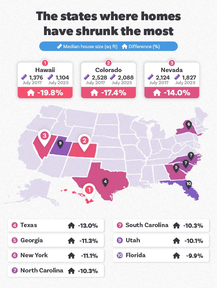 The national figures show homes are getting smaller, but the shift has been far more dramatic in some states. Nine states have seen double-digit declines in median home size, with the biggest shrinkage in Hawaii, Colorado, and Nevada.