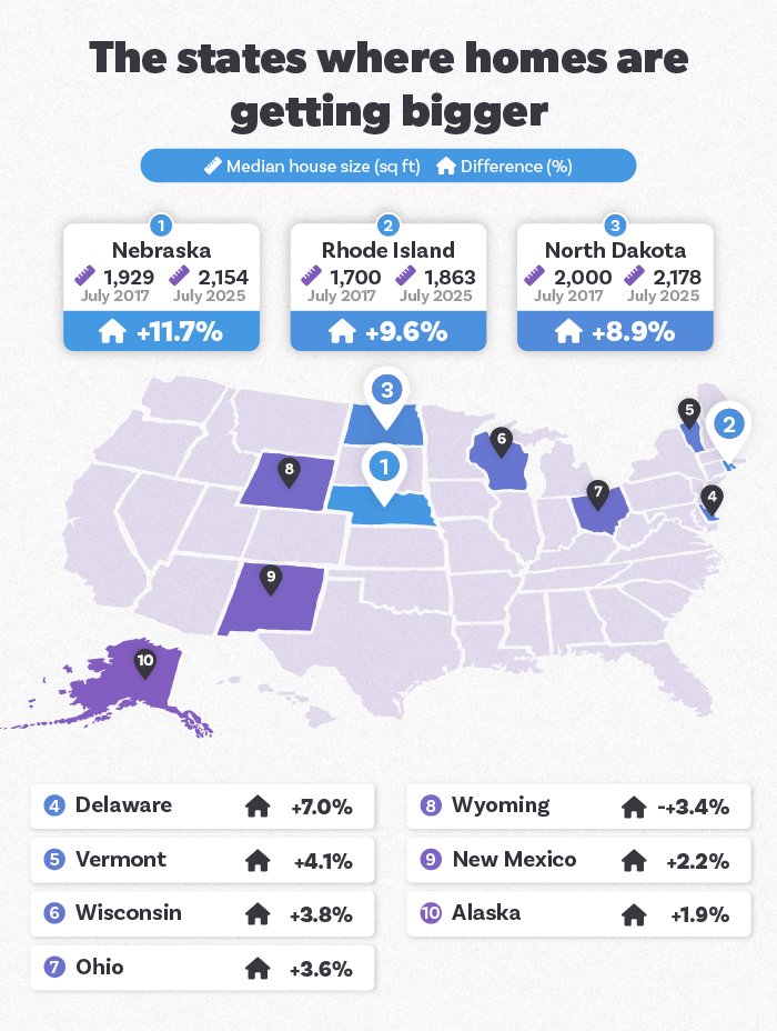 Despite being the smallest state in the country, Rhode Island has seen its median home size increase from 1,700 to 1,863 square feet, which is a 9.6% jump.