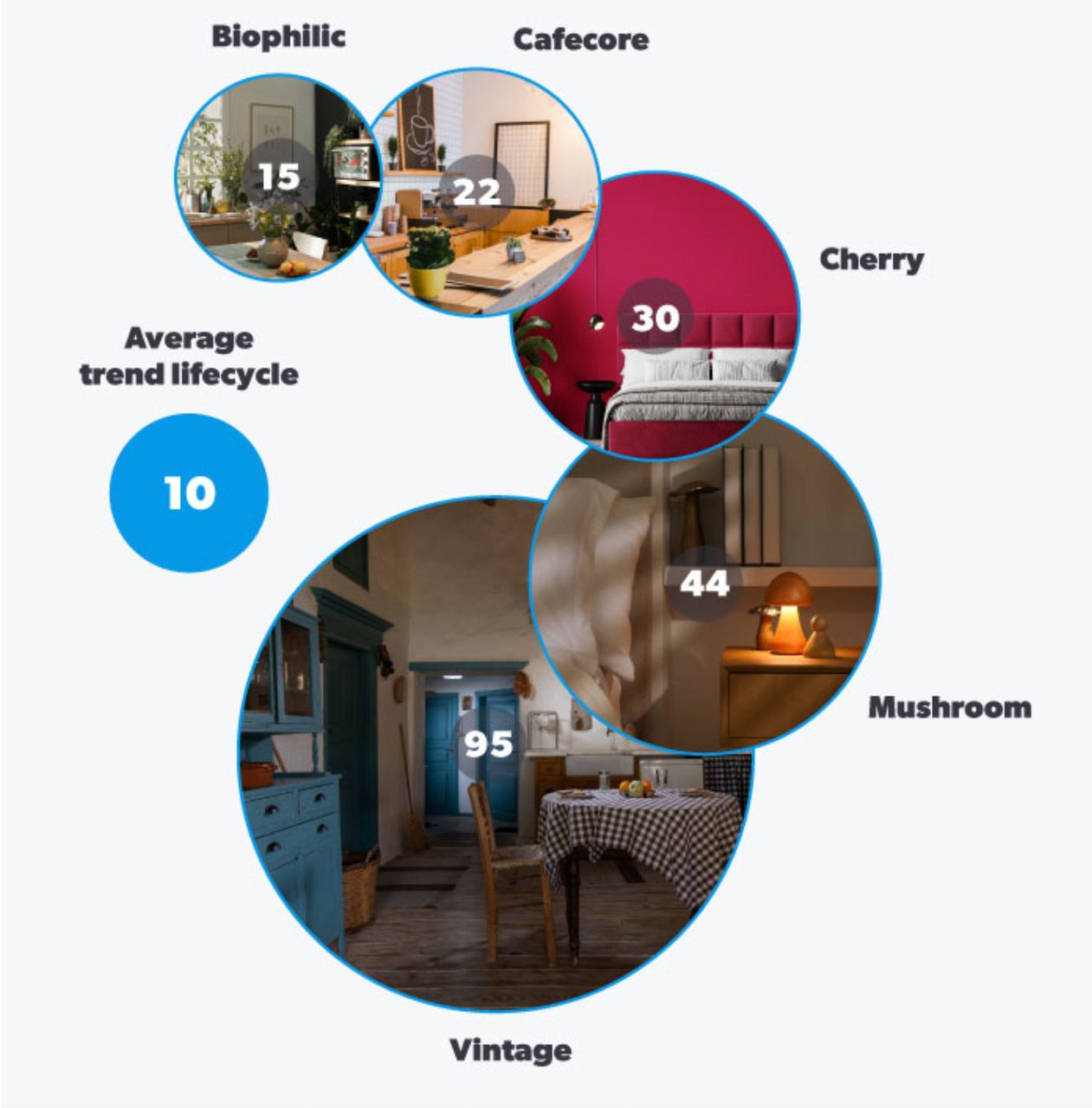 With that in mind, we’ve analyzed trends identified in the last five annual Pinterest Trend Reports, mapping out their rise and fall over the previous 20 years to reveal the average lifecycle of interior design trends.