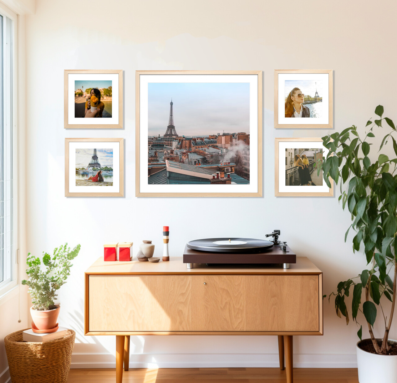 An artful assembly of five square framed photos, curated to showcase your most cherished memories. At the heart of the arrangement is a 23" x 23" centerpiece, flanked by two pairs of 10.5" x 10.5" frames on either side. Each frame in this gallery wall design can be tailored in style to complement your own decor or the characteristics of your photos. The perfect focal point for living rooms, hallways, above a console table, or any area that deserves a touch of style.