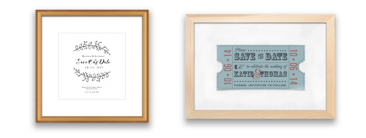 For an item where you want to reveal the entire surface of the paper, for example a menu or Save the Date card where the text goes right to the edges, it's a good choice for when to select a float mount for your frame. This means that the piece sits on top of the matting with some margin around it, as opposed to being overlapped by the matting or inside edge of the frame.