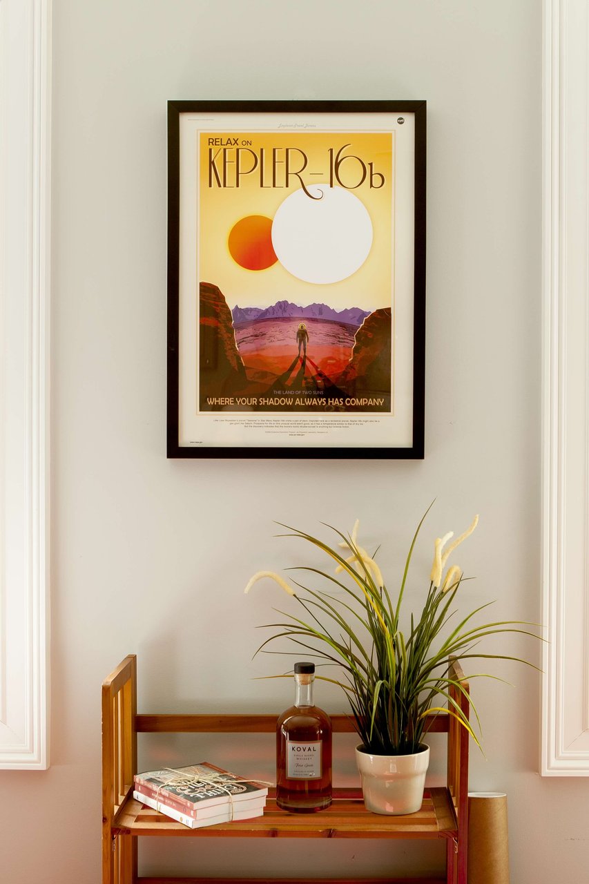 Framed Keplar 16b poster designed for NASA's Jet Propulsion Laboratory